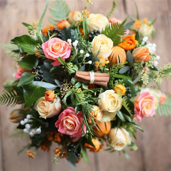 A beautiful bouquet of seasonal flowers in Oranges and Peaches. A modern twist on the traditional christmas bouquet! This design includes festive cinnamon bundles, sliced oranges and lush greenery.